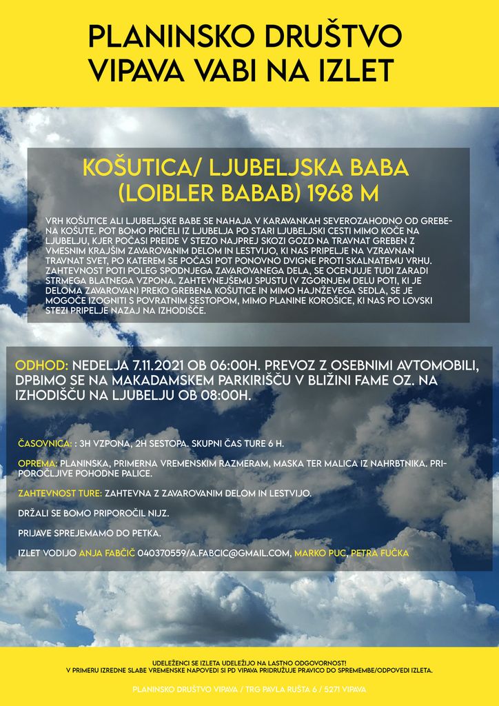 Vrh Košutice ali Ljubeljske Babe se nahaja v Karavankah severozahodno od grebena Košute. Pot bomo pričeli iz Ljubelja po stari ljubeljski cesti mimo koče na Ljubelju, kjer počasi preide v stezo najprej skozi gozd na travnat greben z vmesnim krajšim zavarovanim delom in lestvijo, ki nas pripelje na vzravnan travnat svet, po katerem se počasi pot ponovno dvigne proti skalnatemu vrhu. Zahtevnost poti poleg spodnjega zavarovanega dela, se ocenjuje tudi zaradi strmega blatnega vzpona. Zahtevnejšemu spustu (v zgornjem delu poti, ki je deloma zavarovan) preko grebena Košutice in mimo Hajnževega sedla, se je mogoče izogniti s povratnim sestopom, mimo planine Korošice, ki nas po lovski stezi pripelje nazaj na izhodišče.
