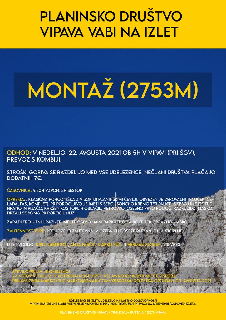 Montaž je najvišji vrh Zahodnih Julijskih Alp in tako le 111m nižji od Triglava. Mogočni stolpi se dvigajo nad dolinami Zajzere, Dunje in Reklanice. Ime »Jof di Montasio« izhaja iz furlanščine, pri nas si nadeva ime Špik nad Policami. Je Kugyeva gora, saj je na njej pustil največ sledi – kar 8 prvenstvenih smeri. Mi se bomo na vrh povzpeli po Findeneggovem ozebniku in sestopili po Pipanovi lestvi nazaj na naše izhodišče, ki bo planina Pecol v dolini Reklanice.