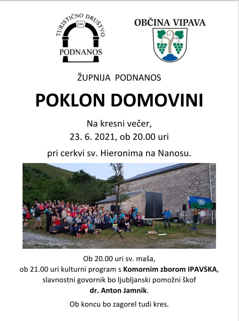 Poklon domovini bo potekal v sredo 23. 6. 2021 ob 20. uri pri cerkvi sv. Hieronima na Nanosu.