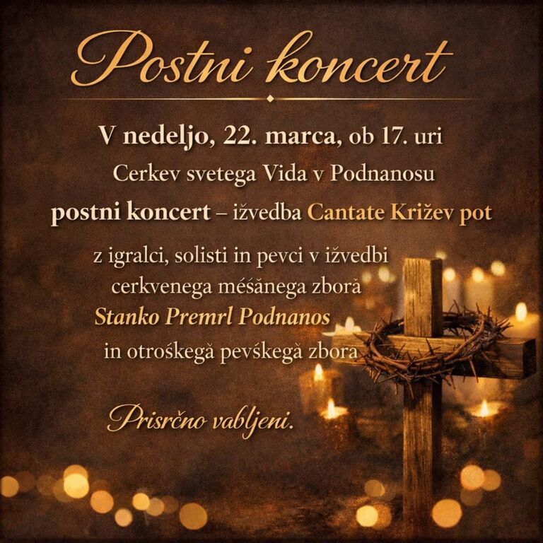 V nedeljo, 22.3.2026 ob 17.00 vabljeni na postni koncert, ki bo v cerkvi sv. Vida v Podnanosu. Postni koncert bo v izvedbi Cantate Križev pot z igralci, solisti in pevci cerkvenega mešanefa zbora Stanko Premrl Podnanos in otroškega pevskega zbora.