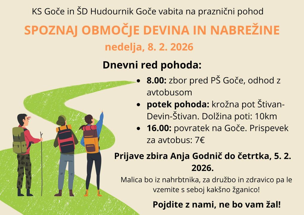 KS Goče in ŠD Hudournik vabita na praznični pohod "Spoznaj območje Devina in Nabrežine", ki bo v nedeljo, 8. 2. 2026.
