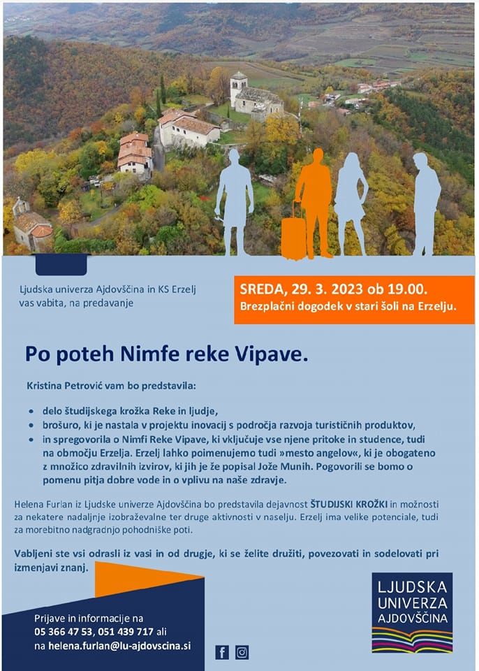 Ljudska univerza Ajdovščina in KS Erzelj vas vabita, na predavanje Po poteh Nimfe reke Vipave.