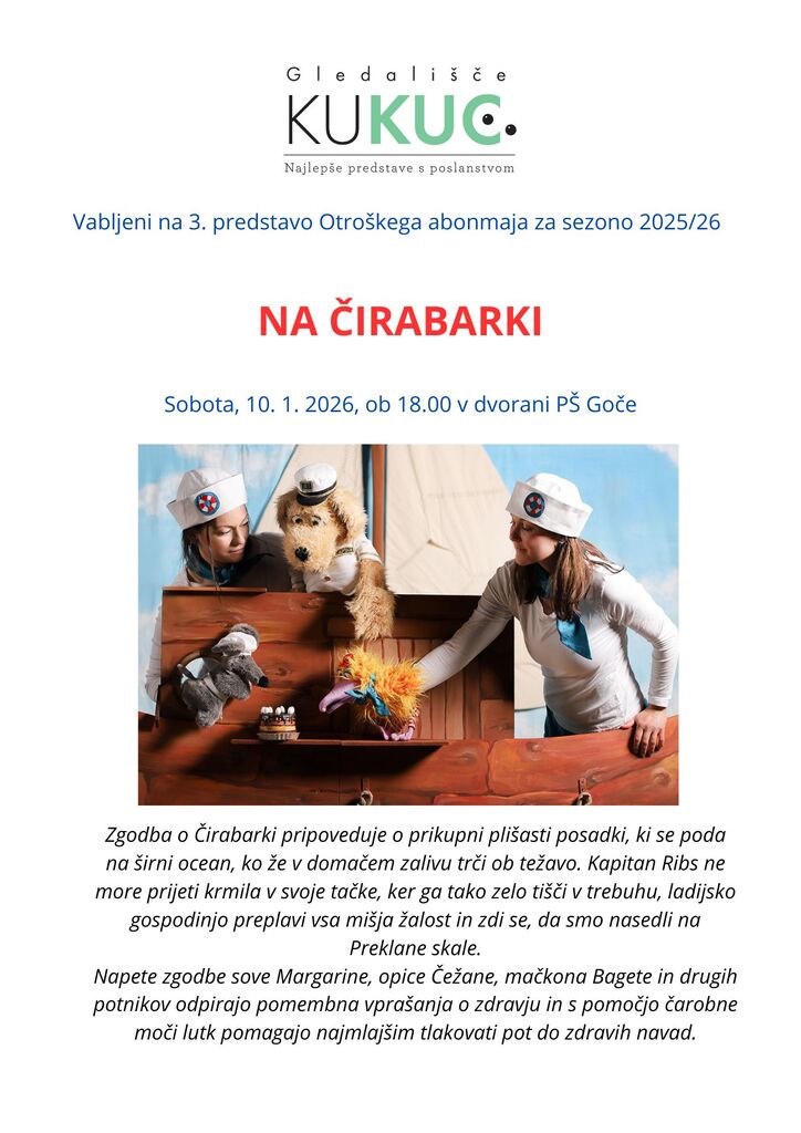Krajevna skupnost Goče v sodelovanju z gledališčem KuKuc, vabi na ogled otroške predstave Na Čirabarki, ki bo v soboto, 10.1.2026 ob 18.00 v dvorani PŠ Goče.