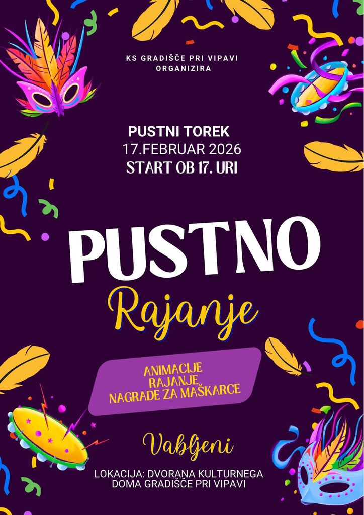 KS Gradišče pri Vipavi vabi na pustno rajanje, ki bo na pustni torek 17. februarja 2026 ob 17.00, v dvorani Kulturnega doma Gradišče pri Vipavi.