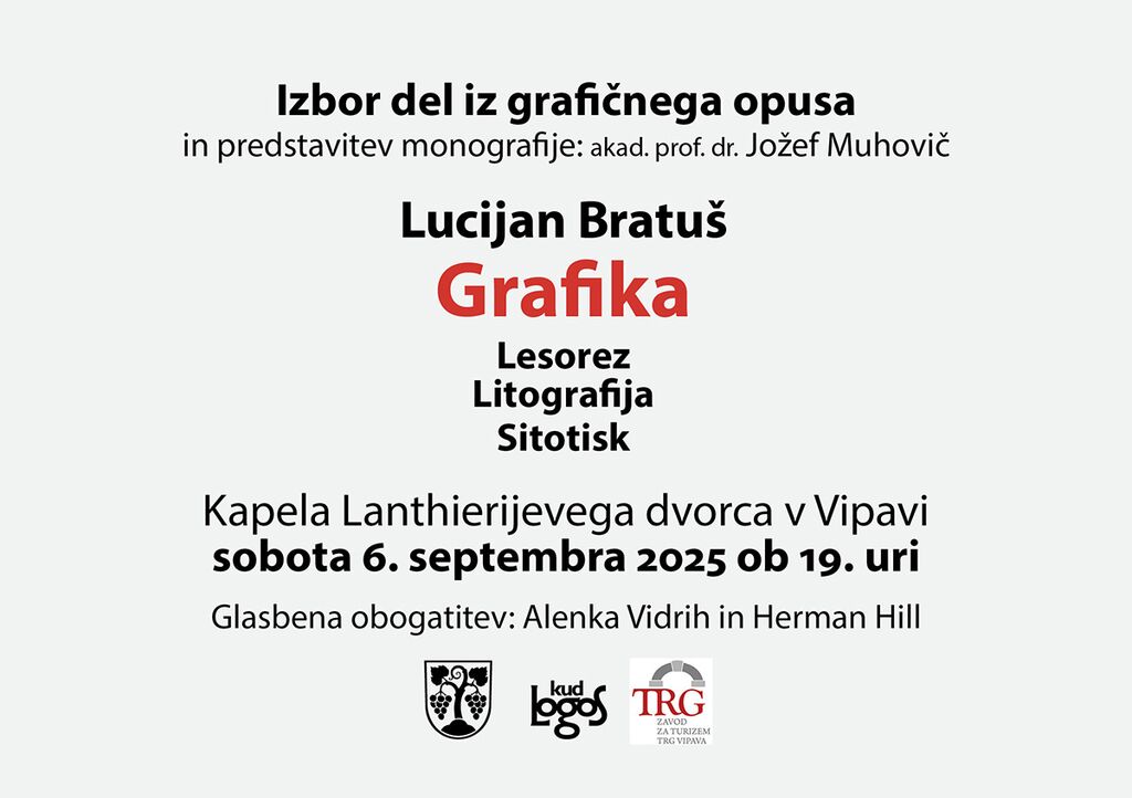 Lucijan Bratuš je znan kot odličen risar, slikar, kaligraf, tipograf in oblikovalec vizualnih sporočil. Svoje ideje pa že od zgodnjih let rad preverja tudi v grafični umetnosti, v naravi njene tehnike in v nadnaravi njene poetike. Kot grafik se je Bratuš zapisal trem grafičnim tehnikam: lesorezu, litografiji in sitotisku. V vsaki od njih je vsebine in oblike razvijal v obliki manjših ali obsežnejših ciklov. Na razstavi v kapeli Lanthierijevega dvorca bodo na ogled dela v vseh treh tehnikah, akad. prof. dr. Jožef Muhovič pa bo predstavil tudi njegovo monografijo.
