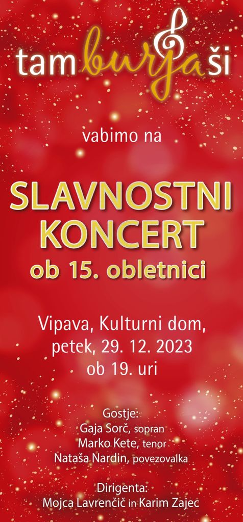 GD Tamburjaši letos zaokrožujemo 15 let delovanja, ki se jih bomo spominjali s slavnostnim koncertom 29. decembra ob 19. uri v Kulturnem domu v Vipavi. Spored sestavlja izbor naših najljubših skladb preteklih let. Koncert bosta s svojima prelepima glasovoma obogatila sopranistka Gaja Sorč in tenorist Marko Kete, ki sta z nami večkrat sodelovala in publiko s svojimi interpretacijami navduševala. Večer, skozi katerega nas bo vodila Nataša Nardin, bo tako razgibano popotovanje na "strunah srca". Lepo vabljeni, da se z lepo glasbo in hvaležnostjo v srcu ozrete na čas za nami in z upanjem v prihodnje dni.