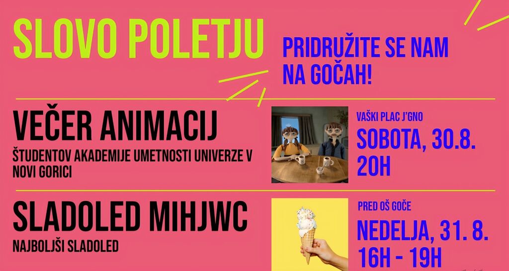 Krajevna skupnost Goče vabi na prireditev Slovo poletju, ki bo potekala v soboto, 30. avgusta, ob 20. uri na vaškem placu J'gno z večerom animacij – predstavitvijo kratkih animiranih filmov študentov Akademije umetnosti Univerze v Novi Gorici.