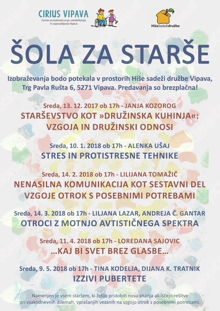 V šolskem letu 2017/2018 v Centru za izobraževanje, rehabilitacijo in usposabljanje Vipava v sodelovanju s Hišo sadeži družbe pričenjamo izobraževalni program za starše.