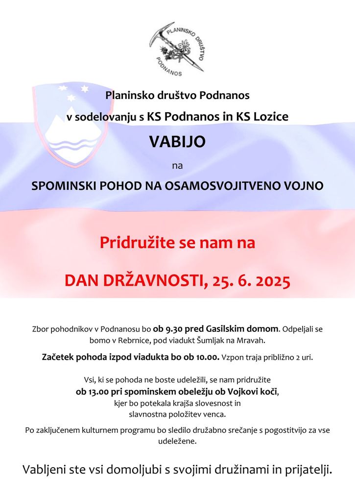 V sredo, 25. 6. 2025 na praznik - Dan državnosti lepo povabljeni na spominski pohod in krajšo slovestnost.