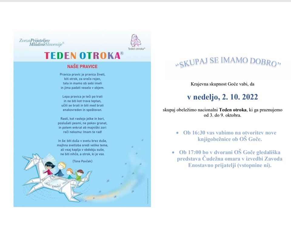 Krajevna skupnost Goče vabi, da v nedeljo, 2.10.2022 skupaj obeležimo nacionalni Teden otroka, ki ga praznujemo od 3. do 9. oktobra.