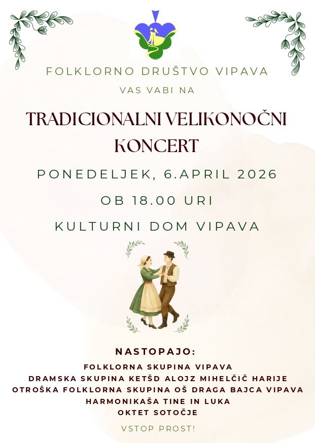 Folklorno društvo Vipava vas vabi na Tradicionalni velikonočni koncert, ki bo v ponedeljek, 6. aprila ob 18.00 uri v Kulturnem domu Vipava.