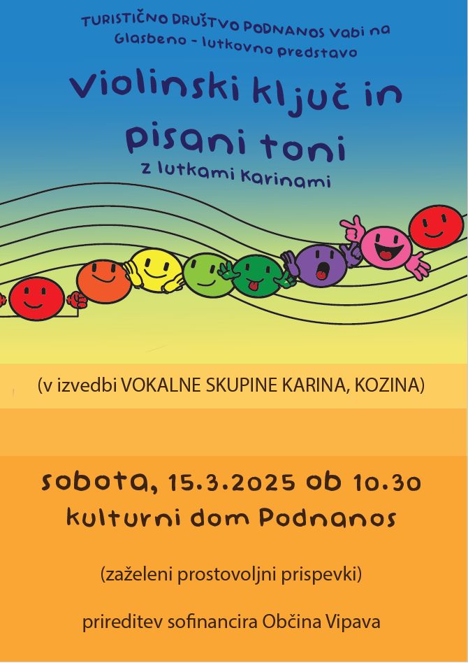 Vabljeni na glasbeno - lutkovno predstavo Violinski ključ in pisani toni z lutkami Karinami v izvedbi vokalne skupine Karina iz Kozine. Predstava bo v kulturnem domu v Podnanosu v soboto 15. marca ob 10.30 uri.