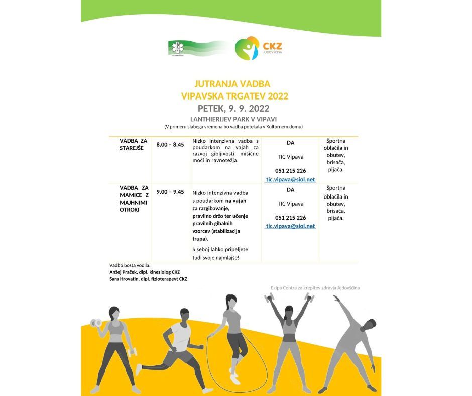 Center za krepitev zdravja vabi na jutranjo vadbo v petek 9.9.2022. Vadba bo potekala v parku pred dvorcem Lanthieri, v primeru dežja pa v Kulturnem domu v Vipavi.