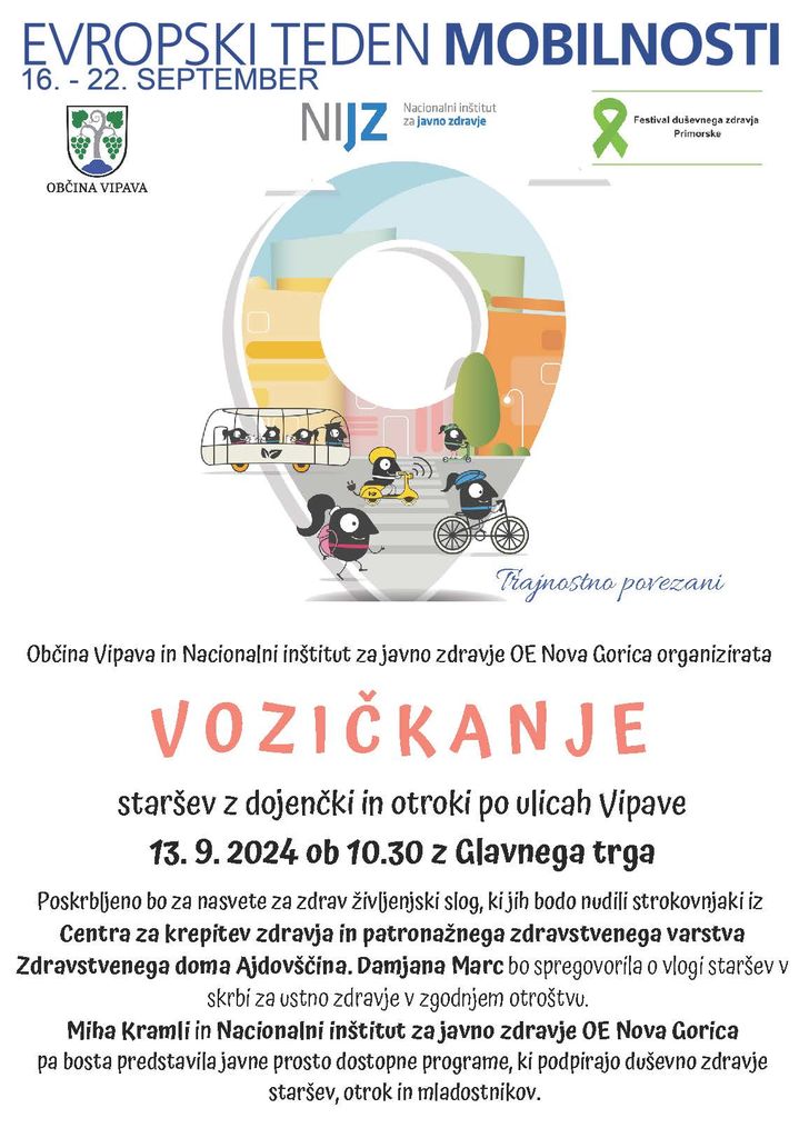 Starši z dojenčki in malimi otroki ste vabljeni, da se udeležite dogodka, ki bo potekal v petek, 13. septembra 2024. Začetek vozičkanja bo na Glavnem trgu v Vipavi ob 10.30.