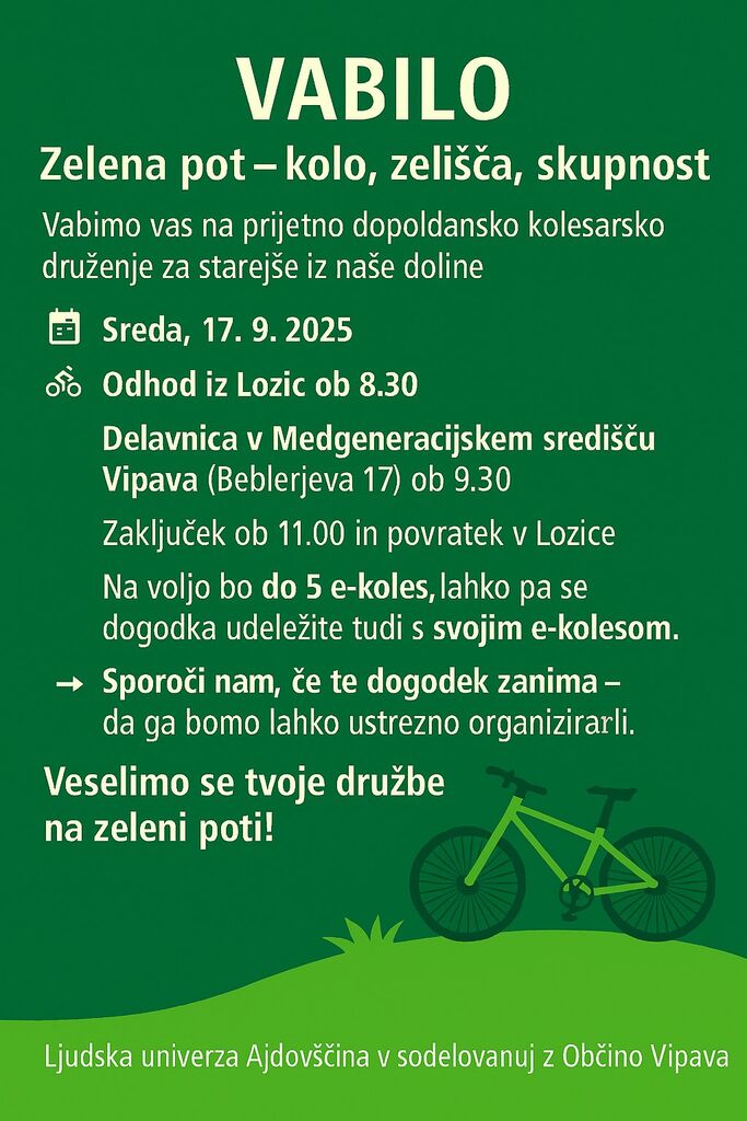 Vabimo vas na prijetno dopoldansko kolesarsko druženje za starejše iz naše doline.