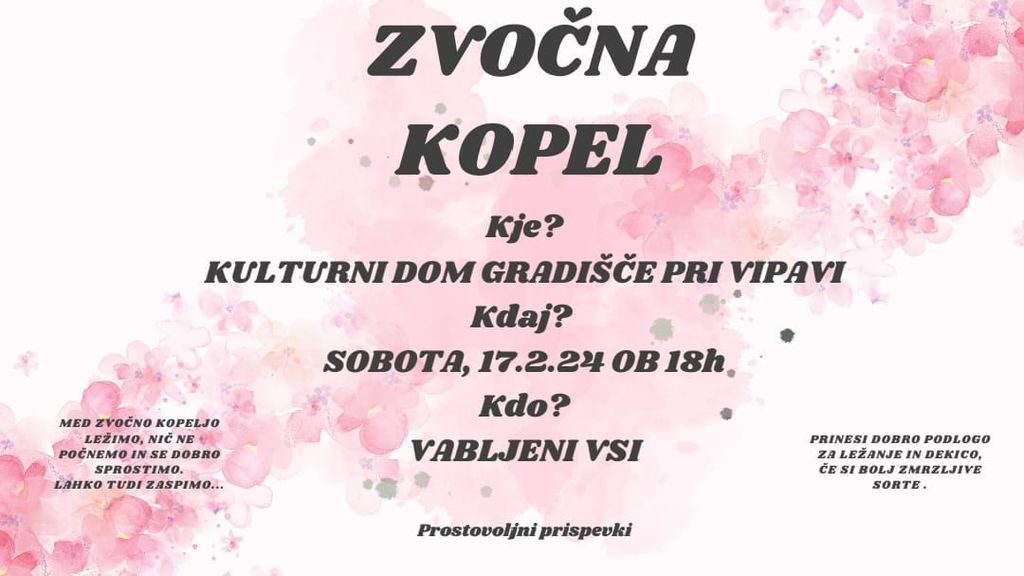 Na zvočno kopel vabljeni v soboto, 17.2.2024 ob 18.00, v Kulturni dom Gradišče pri Vipavi.