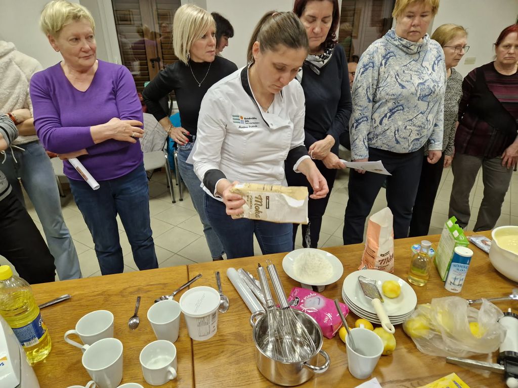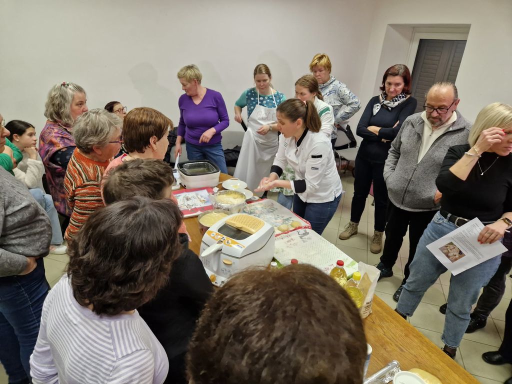 Pod strokovnim vodstvom Martine Fratnik, profesorice praktičnega pouka na Biotehniški šoli v Šempetru pri Gorici, so se udeleženci najprej spoznali z osnovami priprave testa za krofe in jogurtove miške. Po uvodni predstavitvi so zavihali rokave ter pripravili kvasni nastavek in zamesili testo. Med delom je izvajalka razlagala ključne korake, odgovarjala na vprašanja, kot so: Ali gredo v testo le rumenjaki ali cela jajca? Koliko tekočine je potrebno dodati? Kako dolgo mesiti testo? Koliko časa mora vzhajati?