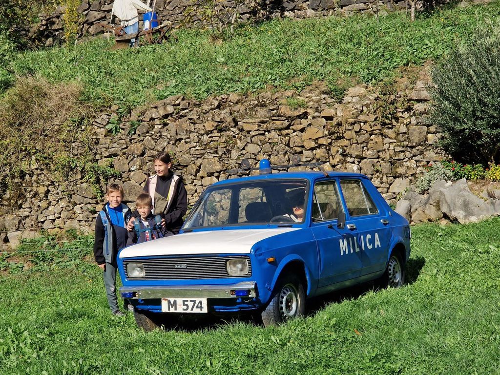 Iz Slapnika smo se spuščali proti izhodišču. Hodili smo po senčnem kolovozu in robu potoka, ki je tekel v dolino, in prišli do vasice Brdce pri Kožbani, kjer smo izkoristili čas za fotografiranje z nekdanjim miličnikom (lutka) v policijskem avtu, ki je čakal. In pot nadaljevali mimo soteske Krčnik do avtobusa. Gočani smo v družbi prijateljev doživeli pravo jesensko pravljico, polno smeha, klepeta in lepi pogledov.