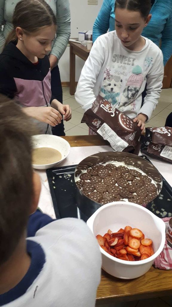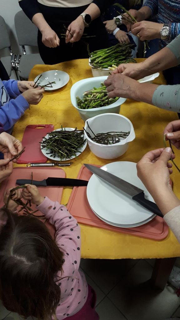Velikonočni meni je bil sestavljen iz petih hodov: špargljeva solata s piščancem kot hladna predjed, nato špargljeva kremna juha s profiteroli, za toplo predjed je bila špargljeva ričota, glavno jed pa so sestavljali svinjski medaljoni v naravni omaki, krompirjeve princeske, dušen grah in sladek hren, za sladico še torta pan di stele z jagodami. Martina Fratnik je udeleženke spretno vodila skozi postopke priprave posamezne jedi, svetovala, naj kaj naj bodo pozorne pri pripravi ter jih seznanila z majhnimi kuharskimi triki, ki olajšajo kuhanje.