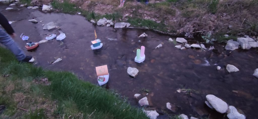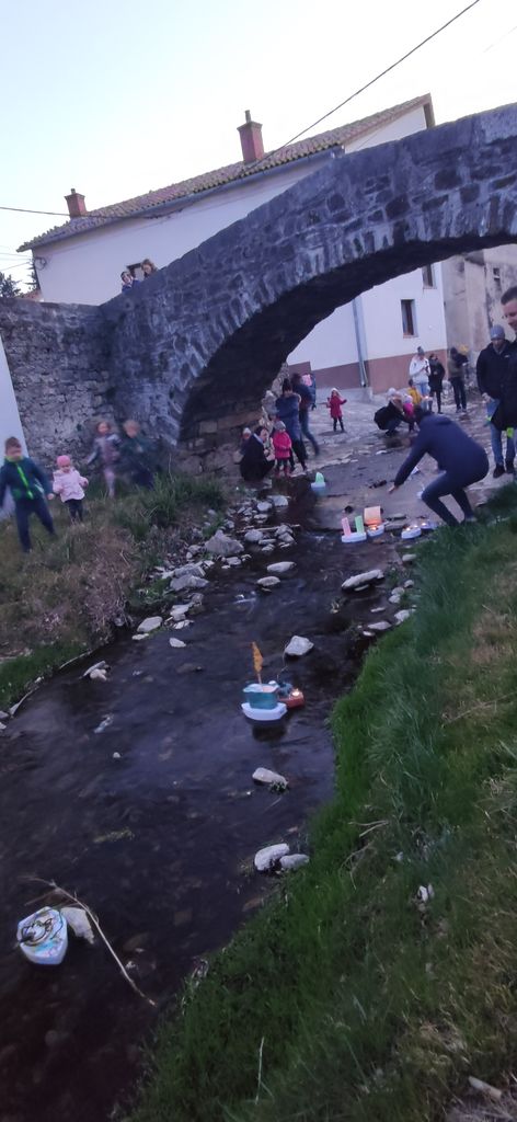 Drugi, družabni del pa smo izpeljali ob spuščanju gregorčkov v vodo. Dobili smo se na predvečer gregorjevega, ko je sonce počasi že tonilo za bližnje hiše. Izpred vrtca smo se skupaj sprehodili do mosta čez Pasji rep v starem delu vasi, kjer smo spustili gregorčke v vodo in s tem simbolično priklicali pomlad. Malce nam je sicer ponagajala burja, a smo vseeno vztrajali. Poskrbeli smo tudi, da nismo onesnaževali okolja in smo gregorčke pred manjšim slapom ujeli in jih vrnili otrokom.