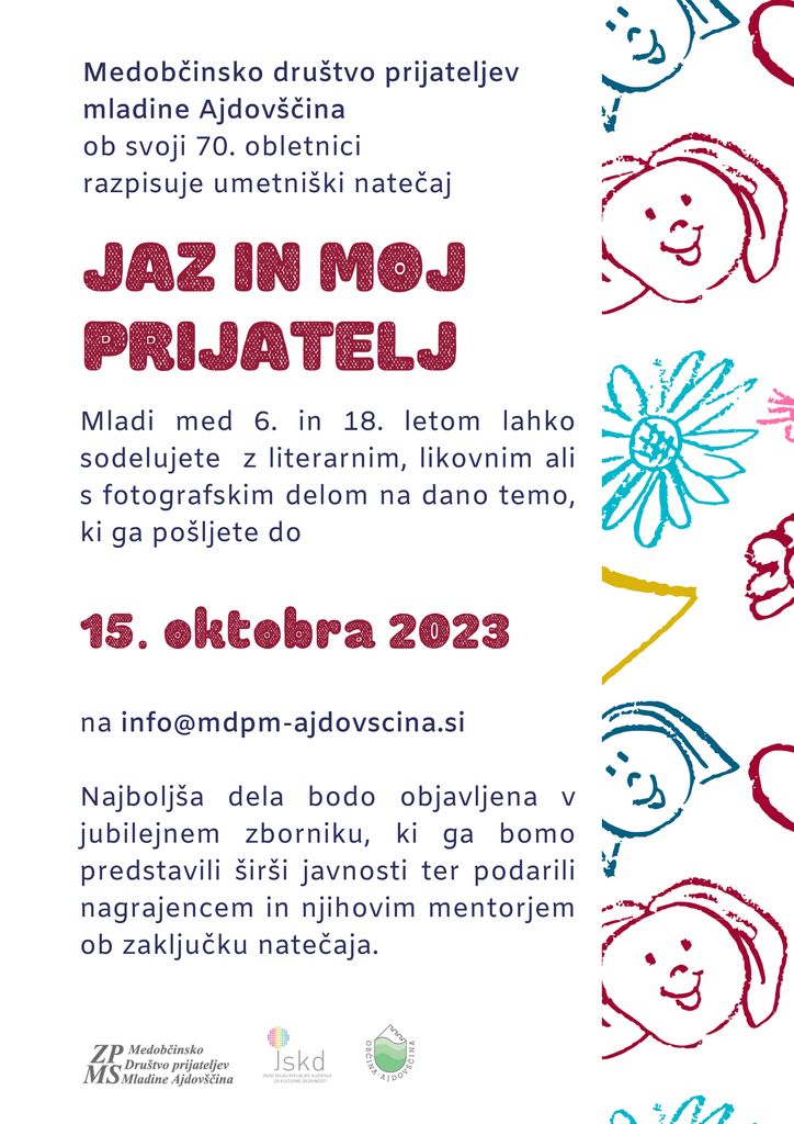 K sodelovanju v umetniški natečaj JAZ IN MOJ PRIJATELJ vabimo vse mlade umetnike med 6. in 18. letom iz občin Ajdovščina in Vipava. Sodelujete lahko z literarnim, likovnim ali s fotografskim delom na dano temo, ki ga pošljete na info@mdpm-ajdovscina.si do 15. oktobra 2023.