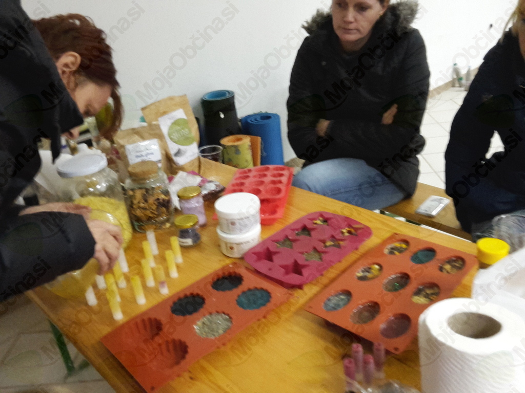 Tretja delavnica pa ja bila v mesecu decembru. Na njej pa smo izdelovali glicerinska mila z zelišči in dišavami primernimi za mesec december. Uporabili smo cimet, pomarančo, limono, vanilijo, jabolko, bleščice. Za ta mila je značilno, da so dokaj hitro narejena , ker ni potrebno dolgotrajno sušenje kot pri milih katere vsebujejo čebelji vosek in so zelo primerna za obdarovanje še posebno za božično novoletne praznike. Na vseh delavnicah je bila kar lepa udeležba pri zadnji pa so udeleženke s seboj prinesle še pecivo. Zahvaljujemo se Nataši za požrtvovalnost in napore ki jih vlaga v izdelavo domačih naravnih izdelkov za zdravje , dober izgled kože ter dobro počutje.