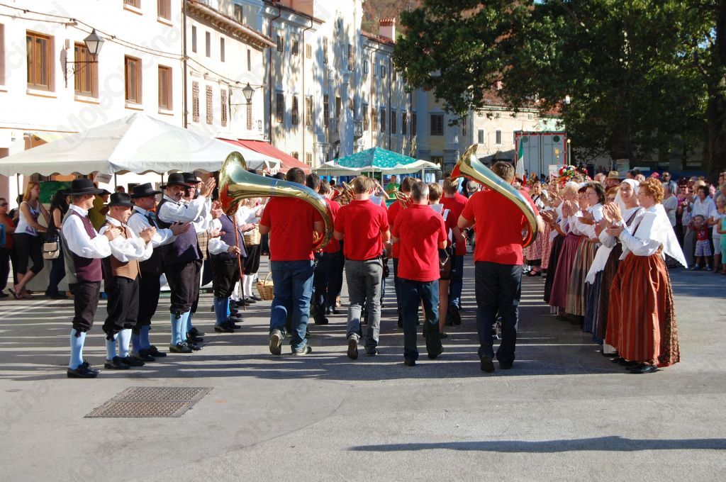 V soboto zjutraj,  8. septembra, smo s harmoniko Italijane pričakali pod sto letnim hrastom pred vasjo Ustje. Po kratkem sprejemu smo skupaj odšli v bližnji vinograd našega plesalca Marjana Vidmarja, kjer smo trgali grozdje. V vinogradu smo imeli pravo kmečko malico po domače, kar na tleh, tako kot nekoč naši predniki. Pokazali smo jim tudi, kako se potem grozdje stiska v mošt in po kosilu smo imeli pokušino vin v Marjanovem hramu. Popoldne smo jih peljali v Mladinski hotel v Ajdovščino, kjer so se odpočili in pripravili na večerni koncert, ki so ga imeli v Domu kulture v Vipavi.