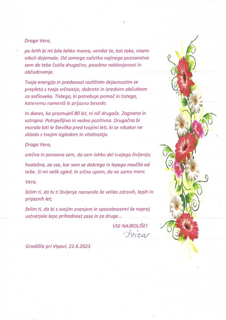 V mesecu juniju je v krogu svojih sorodnikov praznovala že svoj 80. rojstni dan. Kot običajno je tudi letos obiskala svoje dolgoletne prijatelje v VDC Ajdovščina in Vipava, katere je spoznala še kot osnovnošolce pred 30 leti v CIRIUS-u v Vipavi. Žal jih je nekaj že odšlo na počitnice. Obdarila jih je z domačimi dobrotami in sladoledom. Veliko presenečenje pa je bilo, ko so ob obisku pred vrati zaslišali zvoke harmonike. Na njeno pobudo so jo spremljali sovaščani Jernej Krašna s tremi sinovi. Jernej je prostovoljec in dolgoletni krvodajalec. Pri svojih 45-letih je kri že 70-krat daroval. Dejal je, da bo kri daroval, dokler mu bo zdravje dopuščalo. Srečen je, če lahko s krvjo, ki jo daruje, rešuje življenja bolnim. Prepričani smo, da bo dober vzgled tudi svojim štirim sinovom.
