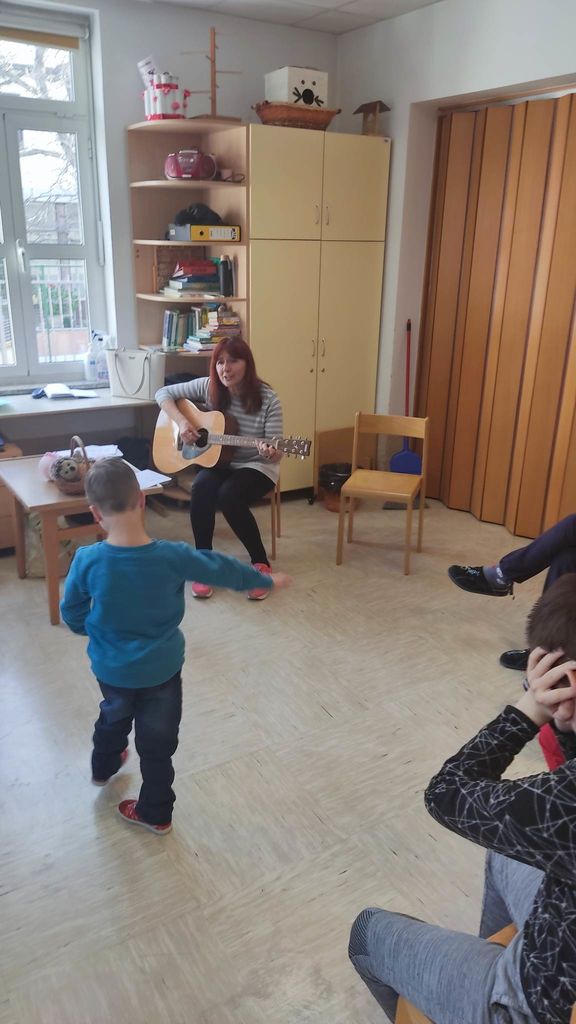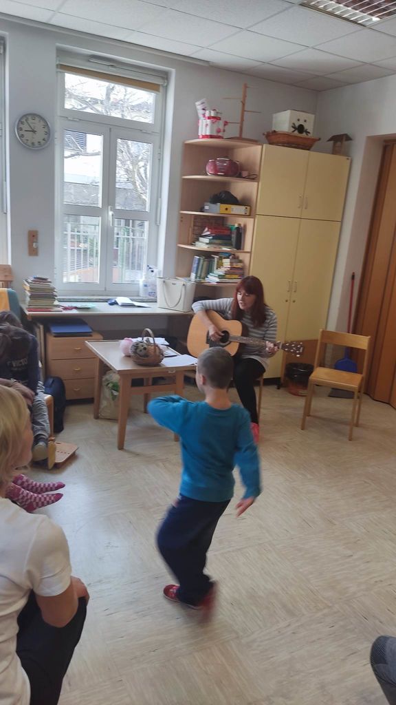 Ni pa pozabila tudi na učiteljice in spremljevalce, saj je tudi nam prebrala nekaj svojih zrelejših pesmi. Učencem je pokazala kitaro, tako da so jo lahko sami držali v rokah in poskusili zabrenkati nanjo. Prav tako so naši učenci gospe Liljani pokazali tudi svoje pripomočke, ki jih potrebujejo pri pouku npr. komunikator. Naši gostji smo v zahvalo z učenci pripravili nekaj pesmic oz. glasbeno - gibalnih iger, s katerimi si popestrimo dopoldneve v šoli in se ji na tak način tudi predstavili. Nato smo z učenci izdelali še voščilnice in majhno pozornost za mame ob materinskem dnevu. Gospa Liljana je obiskala tudi učence na šesti stopnji, kjer so prav tako skupaj zapeli in zraven tudi likovno ustvarjali.