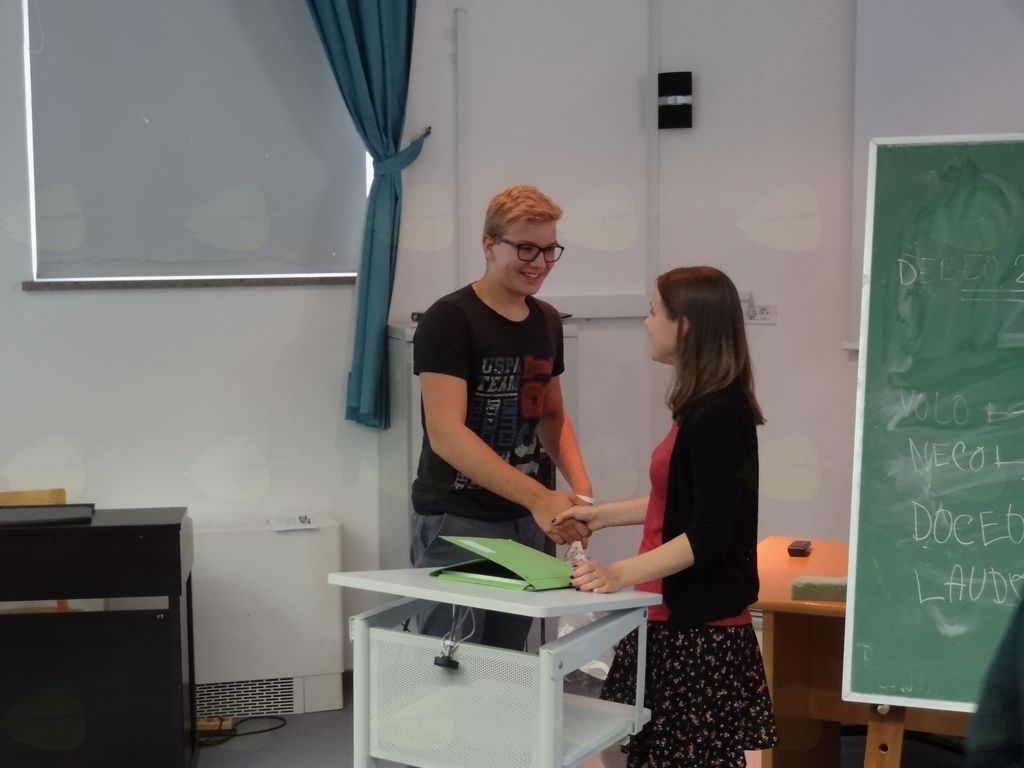 To je spoznala tudi skupina devetošolcev iz OŠ Draga Bajca Vipava, ki je v sredo, 20. 9. 2017, v okviru projekta Jeziki štejejo in evropskega dneva jezikov, obiskala pouk tega jezika na bližnji Škofijski gimnaziji. Učence je prijazno sprejel pomočnik ravnatelja, g. Alojz Grahor, k uri se je za hip pridružil ravnatelj, g. Vladimir Anžel, najbolj pa so bili veseli truda Polonce Zupančič, profesorice latinščine. Pouk je zasnovala tako, da so učenci spoznali, kako se v latinščini spregajo glagoli, da so prepoznali nekatere besede in ugotovili, da latinščina, če imaš le nekaj podlage iz angleščine ali italijanščine in veselja do jezikov, sploh ni tako težka. Kaj ne, če pa npr. AMO pomeni ljubim tako v italijanščini kot v latinščini, VOLARE leteti, MONSTRARE (pokazati) pa se skriva v besedah MONSTER (angl. pošast), MOSTRARE (ital. pokazati) in nenazadnje v slovenščini DEMONSTRACIJA. Devetošolci so nedvomno opazili podobnosti med poimenovanji glagolskih časov: PREZENT – presente (sedanjik), INFINITIV – infinitive/infinito (nedoločnik