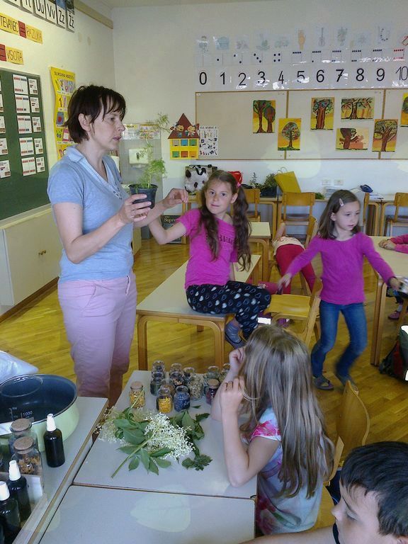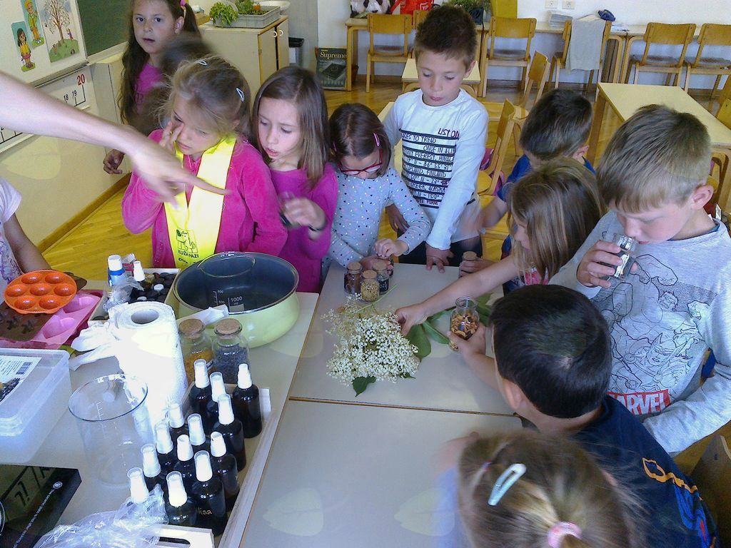 Z radovednostjo smo jo poslušali, ko nam je predstavljala najrazličnejša zelišča, ko so bila posušena in skrbno pospravljena v manjših kozarčkih. Zelišča smo si ogledovali, jih tipali in vohali. Sledila je izdelava zeliščnega mila. Gospa Nataša je najprej segrela milo, ki je bilo v trdnem stanju. Pri tem smo ji morali pomagati pri mešanju. Nato si je vsak izmed nas izbral svoj silikonski modelček. Vanj smo natrosili zelišče, ki smo si ga izbrali, nekaj bleščic ter kapljice eteričnega olja. Sledilo je vlivanje mila. Komaj smo dočakali, da so se naša mila strdila in smo jih lahko prijeli v roke. Bila so čudovita!