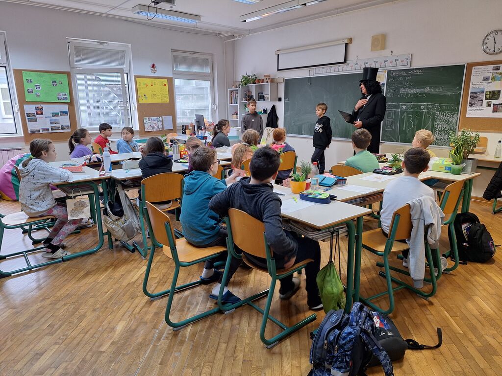 V 4. a razredu nas je g. Prešeren obiskal ravno med poukom likovne umetnosti, kjer smo risali njegov portret. Občudoval je učence pri delu in z veseljem prisluhnil tudi 7. kitici Zdravljice, slovenski himni, ki so mu jo učenci zapeli ob kitari, saj se pripravljajo na ponedeljkovo šolsko prireditev ob prazniku, kjer bo na programu tudi ta skladba.