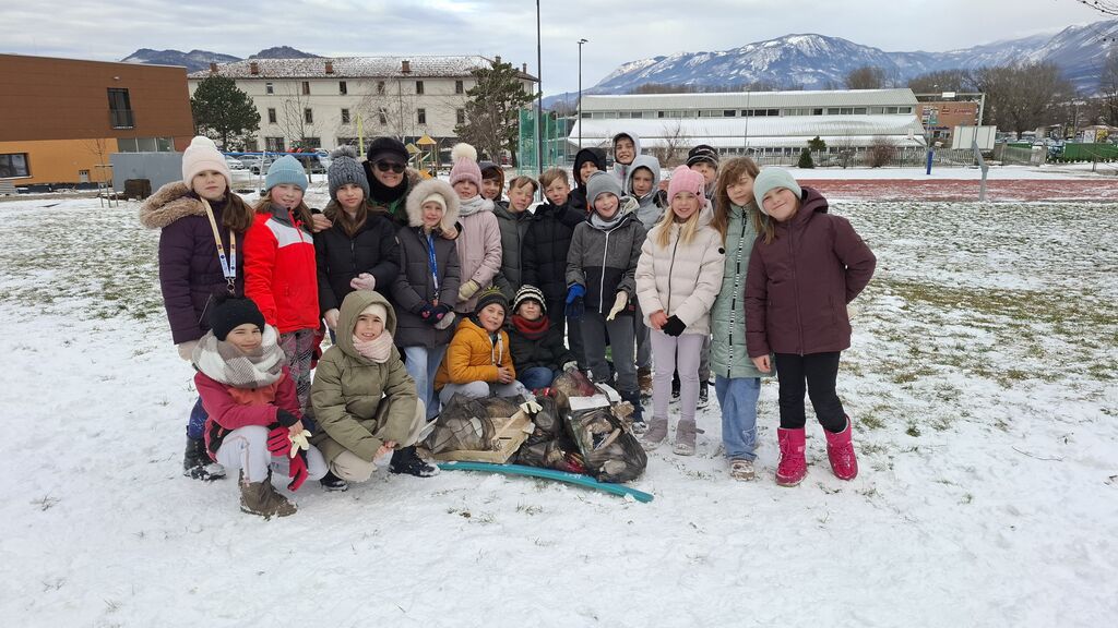 Naslednji dan so se v mraz in sneg spet zapodili tudi učenci 4. a, ki so bili na vrsti za čiščenje šolske okolice. Po novoletnih praznikih smo že prejšnji dan z igrišča pospravili ostanke petard in raket, ta dan pa smo šli okrog šole in si mislili, da smeti verjetno niti videli ne bomo, saj jih je prekril sneg. Pa smo se krepko ušteli in napolnili pet vreč s plastenkami, papirji, vrečkami od čipsa, elektronskimi odpadki starega tiskalnika ...