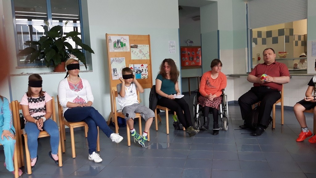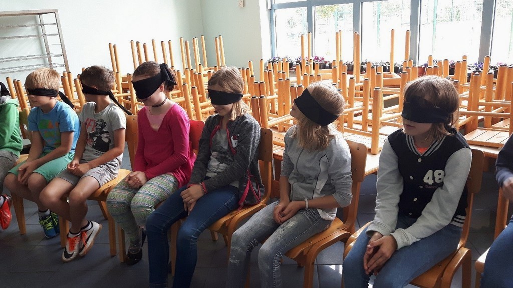 Delavnico smo izvedli v ponedeljek, 6. junija 2016. Pridružili so se tudi tretješolci, da je bilo lepše in da smo delili nove izkušnje. Spoznali smo gospoda Vikija Vrtačnika in njegovo ženo Tino. Sedeli smo v krogu. Razmišljali smo, kako prepoznamo invalida, kako bi mu pomagali in da mu je potrebna naša pomoč. Vživeli smo se v slepega oz. slabovidnega. S trakom smo si zavezali oči in se predstavili, kar pa nam je bilo zelo težko. Gospod Viki je predstavil pripomoček – palico za slepe in kako jo uporablja. Sprehodil se je v krogu na drugo stran s pomočjo palice. Naloga dveh prostovoljnih učencev pa je bila, da ga pripeljeta nazaj na mesto, kjer je sedel. Seveda smo vsi pomagali z nasveti. Spoznali smo, da se je najprej potrebno predstaviti, prijeti slepega človeka za roko in mu veliko govoriti in opisovati, da ga vodimo nazaj na svoje mesto oz. pripeljemo na željen kraj. Zato imata z ženo Tino, ki je na invalidskem vozičku, asistentko Marušo, ki jima pomaga, ju prevaža in skrbi za njihovo družino, saj imata tudi hčerko Tjašo, ki že hodi v šolo. Seveda je gospod Viki obiskoval posebno šolo, da se je veliko naučil za samostojno življenje; brati Braillovo pisavo, pisati na računalnik, prepoznati čas na uri, uporabljati mobitel …, da lahko živi v stanovanju v bloku. Svet prepoznava v temi z vsemi drugimi zdravimi čutili. Seveda bi mu bilo življenje težje brez pomoči zdravih ljudi.