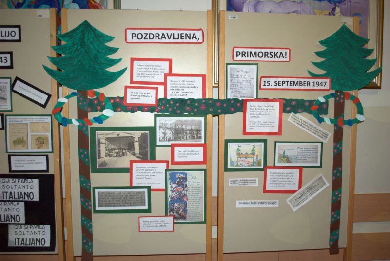 Državni praznik smo obeležili tudi v naši šoli. Na monitorju v avli je učiteljica Elena Kodre Nabergoj pripravili zanimivo računalniško projekcijo. Pri urah zgodovine in dodatnega pouka smo se učili o času pred 70. leti. Z učenkami 9. b razreda pa smo v avli šole postavile razstavo. Z mentorico Ano Kobal smo izpostavile tri mejnike v zgodovini Primorcev: leto 1915, ko je bil podpisan Londonski sporazum, čas življenja Primorcev pod Italijo in leto 1947, ko je bila Primorska vrnjena Sloveniji in Jugoslaviji. Kot so takrat ljudje krasili svoje kraje, smo tudi mi okrasili panoje: z mlaji, venčki in šrangami iz papirja.