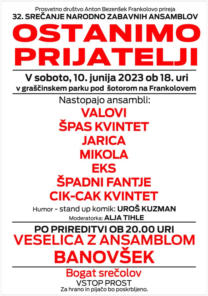 Vabljeni na 32. srečanje narodno zabavnih ansamblov »OSTANIMO PRIJATELJI«, Veselica z ansamblom Banovšek ter bogatim srečelovom.