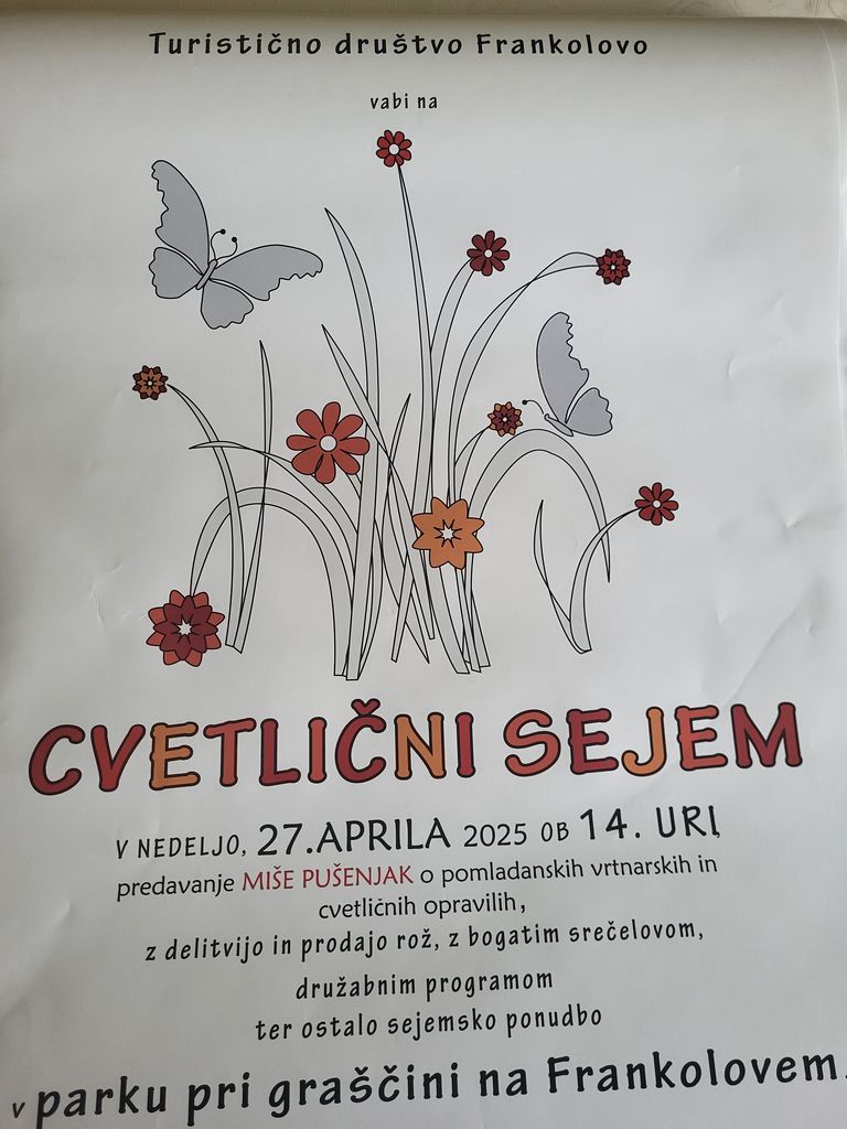 Upajmo, da bo v nedeljo popoldne, 27. aprila, od 14. ure dalje, lepo vreme. Dogajalo se bo vse, kar je navedeno na plakatu: ga. Miša Pušenjak vam bo povedala kaj in kako saditi in sejati, Guštni muzikanti bodo skrbeli za dobro voljo, pekli bomo palačinke, izmenjavali semena in knjige, žrebali obešanke z rožami izmed članov, ki so letos že plačali članarino, članarino, 10 €, boste lahko plačali tudi na sejmu, rože boste lahko tudi kupili, izmenjavali semena, prišli bodo razstavljalci s suho robo, čebulicami lilij, čebelarji, Klučarjeva domaćija, Društvo Dobra volja....