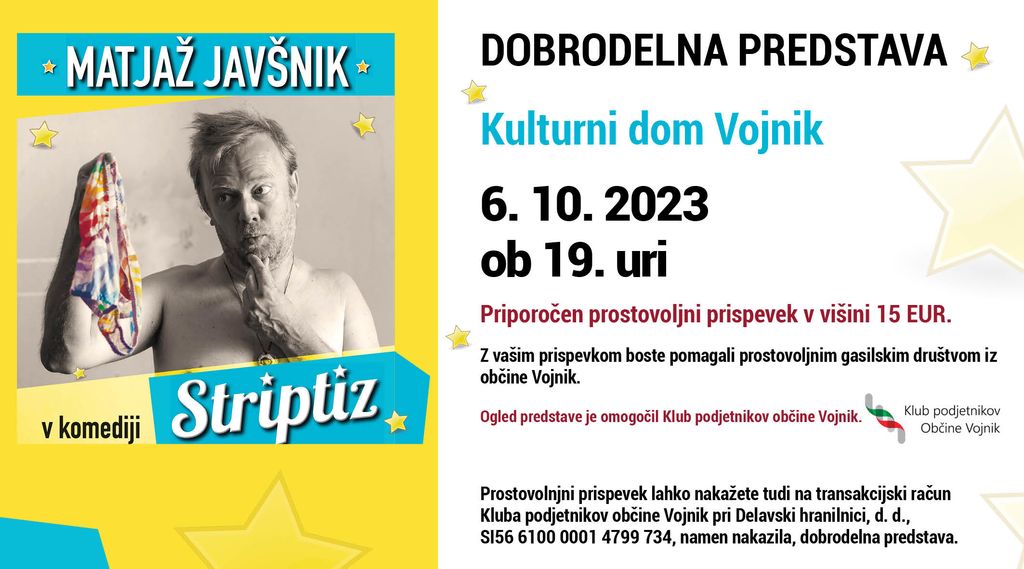 Vabljeni na dobrodelno predstavo Matjaža Javšnika v komediji Striptiz v petek, 06. 10. 2023 ob 19. uri. Priporočen prostovoljni prispevek v višini 15 EUR.
