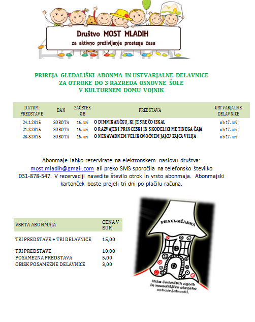 031-878-547. V rezervaciji navedite število otrok in vrsto abonmaja. Abonmajski kartonček boste prejeli tri dni po plačilu računa.