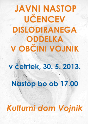 Glasbena šola Celje in Občina Vojnik vabita na javni nastop učencev dislociranega oddelka glasbene šole v Kulturni dom Vojnik, v četrtek, 30. 5. 2013 ob 17.00. Vstopnine ni. Lepo vabljeni.
