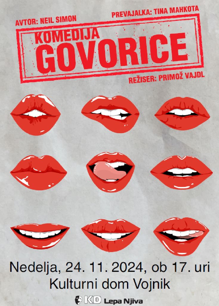 Kulturno društvo Lepa Njiva vljudno vabi na ogled komedije z naslovom Govorice, ki bo v dvorani Kulturnega doma v nedeljo, 24. novembra 2024, ob 17. uri.