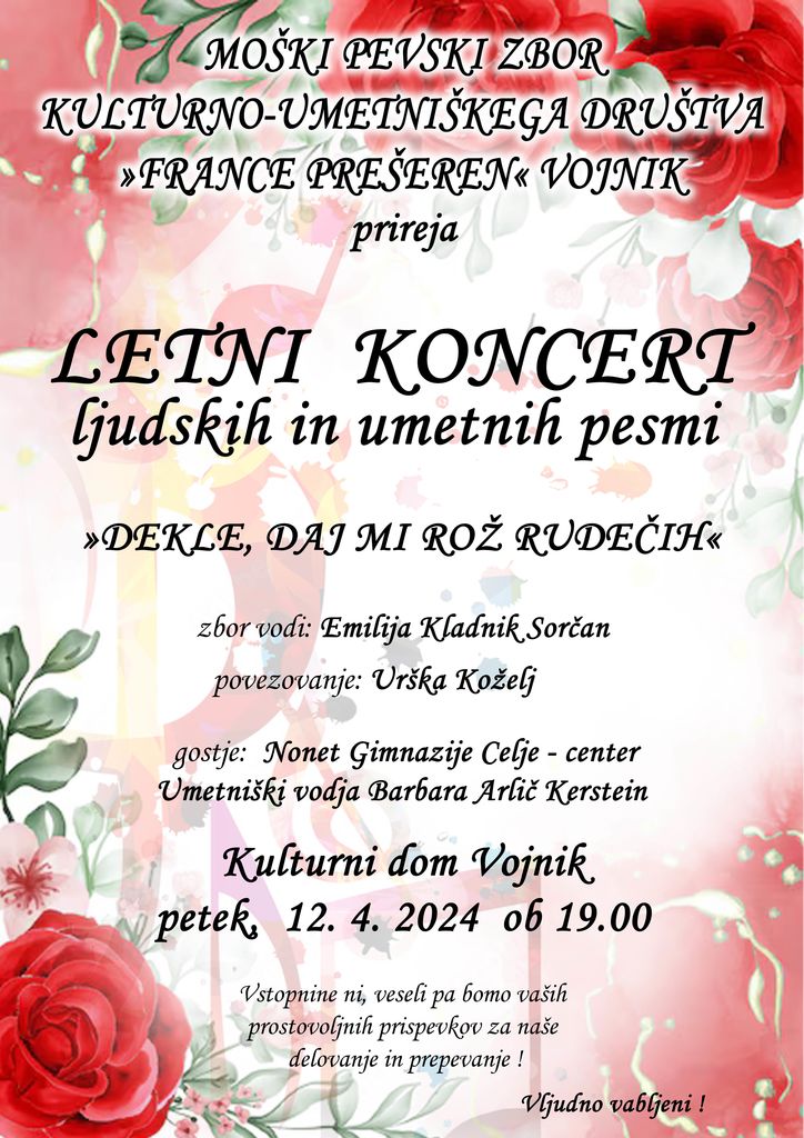 Vludno vabljeni na redni LETNI KONCERT LJUDSKIH IN UMETNIH PESMI MPZ FRANCE PREŠEREN VOJNIK »DEKLE, DAJ MI ROŽ RUDEČIH«