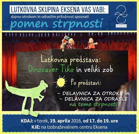 Vabimo vas na LUTKOVNO PREDSTAVO IN DELAVNICO Dinozaver Tiko in veliki zob, ki bo potekala v torek, 19. aprila 2016, od 17. do 19. ure na Izobraževalnem centru Eksena (Cesta Leona Dobrotinška 2, 3230 Šentjur).
