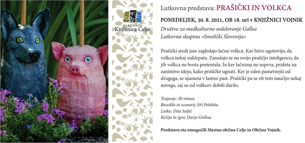 Vabljeni mali in veliki ljubitelji lutk v Knjižnico Vojnik v ponedeljek, 30. 8. ob 18. uri na ogled lutkovne predstave Prašički in volkca, ki jo bo za vas izvedla Darja Grdina.
