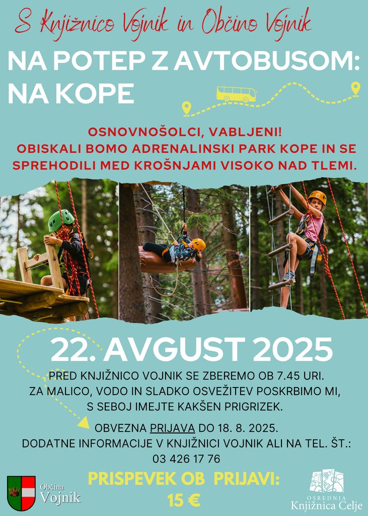 Knjižnica Vojnik in Občina Vojnik vas tudi letos vabita na poletno ekskurzijo! Skupaj se bomo ponovno podali na raziskovanje lepot Slovenije – tokrat nas pot vodi na Kope!
