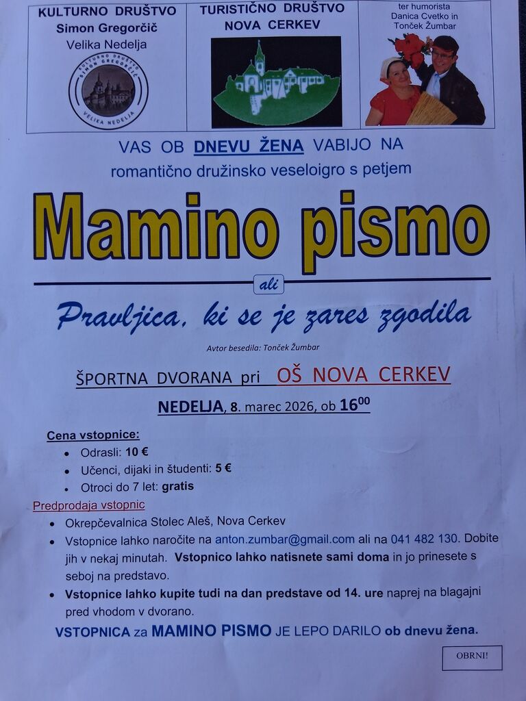 Organizator: TD Nova Cerkev, Kulturno društvo Simon Gregorčič, Velika Nedelja