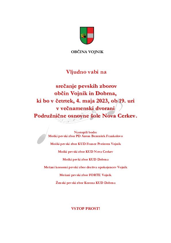 Občina Vojnik vljudno vabi na Srečanje pevskih zborov občin Vojnik in Dobrna, ki bo v četrtek, 4. maja 2023, ob 19. uri v večnamenski dvorani Podružnične osnovne šole Nova Cerkev.