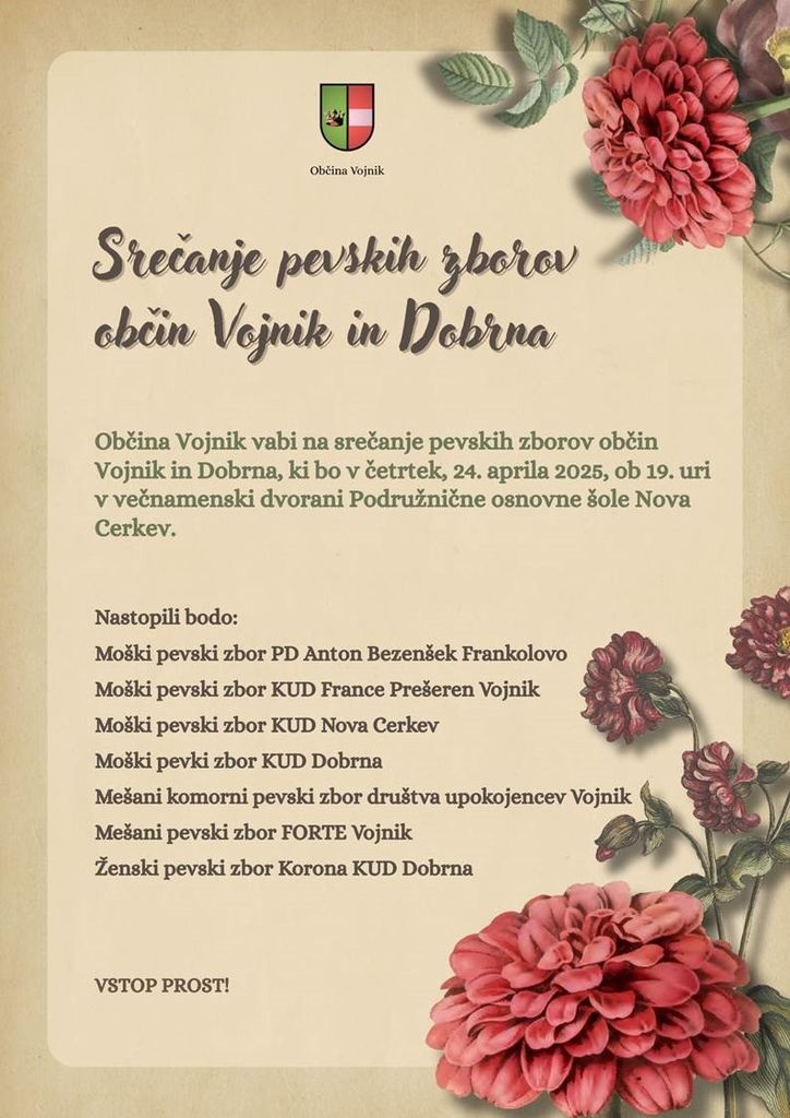 Občina Vojnik vabi na srečanje pevskih zborov občin Vojnik in Dobrna, ki bo v četrtek, 24. aprila 2025, ob 19. uri v večnamenski dvorani Podružnične osnovne šole Nova Cerkev