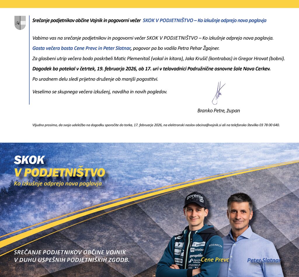 Organizator: Vljudno prosimo, da svojo udeležbo na dogodku sporočite do torka, 17. februarja 2026, na elektronski naslov obcina@vojnik.si.