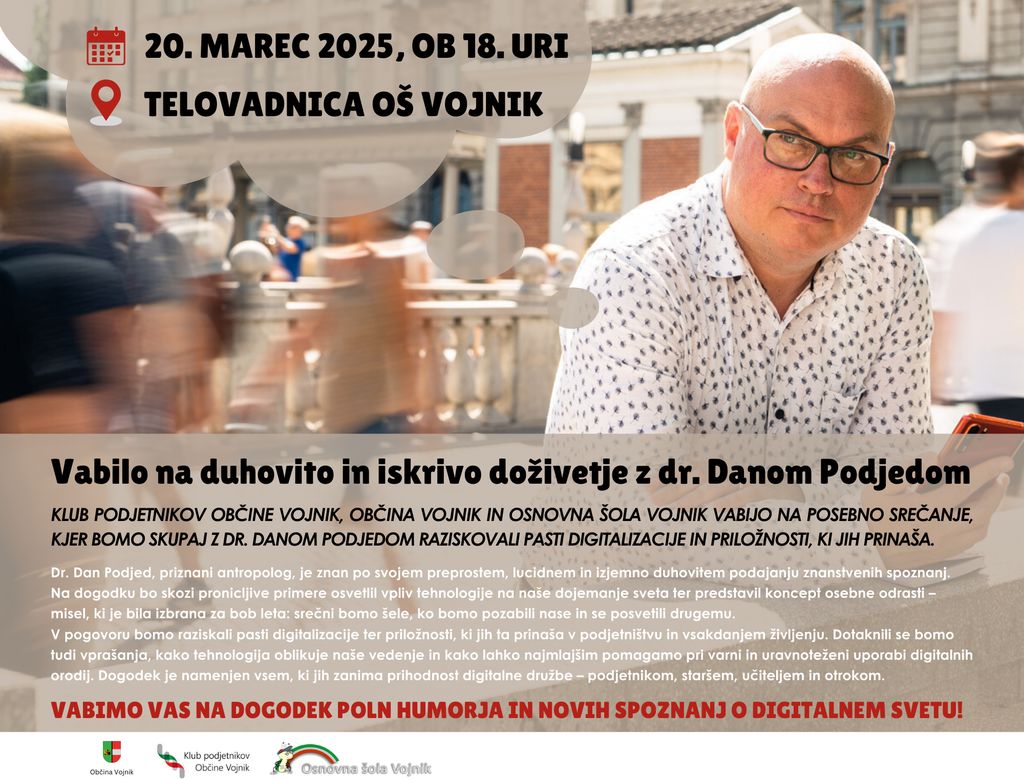Klub podjetnikov Občine Vojnik, Občina Vojnik in Osnovna šola Vojnik vabijo na posebno srečanje, kjer bomo skupaj z dr. Danom Podjedom raziskovali pasti digitalizacije in priložnosti, ki jih prinaša.